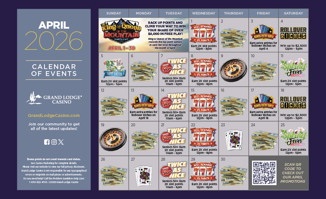 Win your share of over $8,000 IN FREE PLAY! Rack up points and climb your way to free play. King or Queen of the Mountain rewards the top point earners in each tier level throughout the month of April.